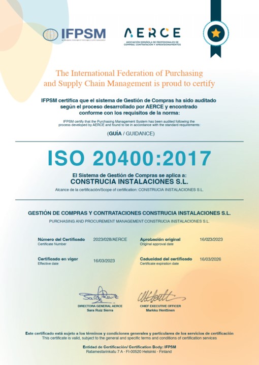 Construcía y Construcía Instalaciones obtienen la ISO 20400, gracias al esfuerzo del Departamento de Compras de Grupo Construcía, liderado por Óscar Pisano, con el apoyo del Director de Sostenibilidad David Martínez.