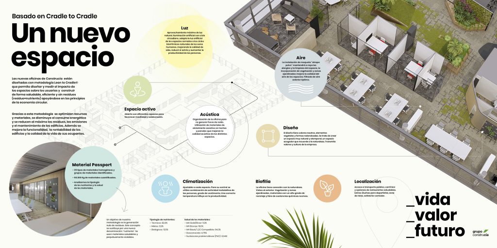 Lo hemos hecho sin sustancias tóxicas, con nuestra metodología de construcción LEAN2CRADLE ®, una manera innovadora de construir que nos permite diseñar espacios y medir su impacto sobre las personas. Lo hacemos de forma saludable, eficiente y sin residuos, mejorando la rentabilidad de los edificios, minimizando su mantenimiento y mejorando la calidad de vida de sus ocupantes.
